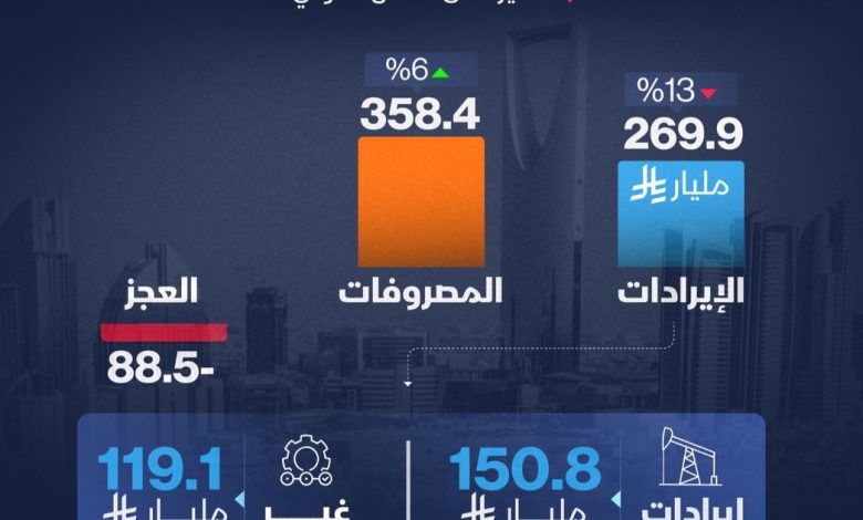 في المقابل، تراجعت الإيرادات بنسبة 13% لتبلغ 269.9 مليار ريال، بعد أن انخفضت الإيرادات النفطية 21% إلى 150.8 مليار ريال، بينما ارتفعت الإيرادات غير النفطية 1% إلى 119.1 مليار ريال.