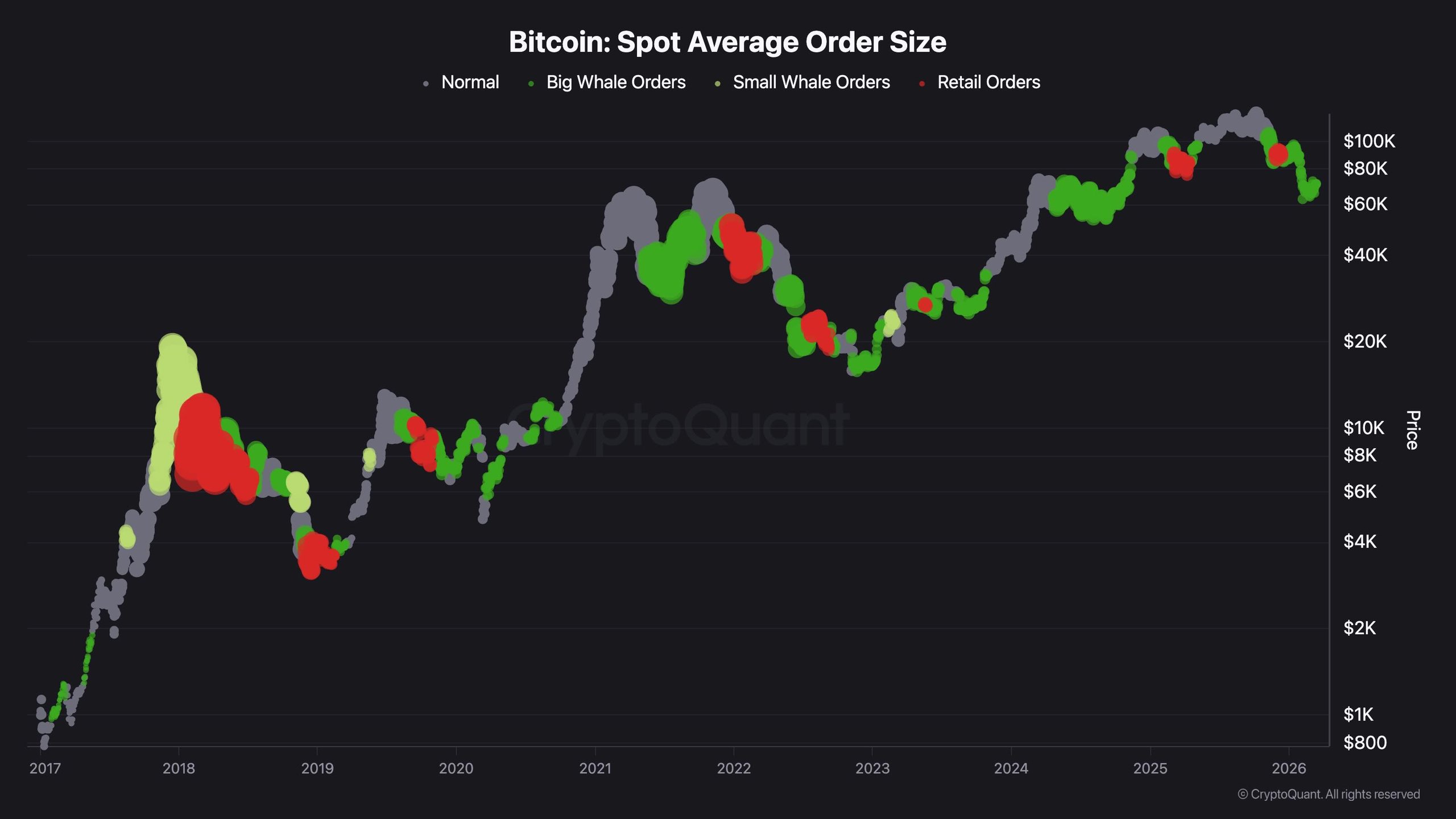 تضيف الصورة الموجودة على السلسلة مسحة بناءة أكثر. يظهر الرسم البياني لمتوسط حجم الطلب الفوري أن النشاط الأخير لا يزال مدفوعًا بمشاركين أكبر حجمًا أكثر من سلوك أسلوب البيع بالتجزئة العدواني. تاريخياً، يميل هذا النوع من الخلفية إلى أن يكون أكثر صحة من التحرك الذي يقوده صغار المشترين المبتهجين، لأنه يشير إلى أن الأيدي الأقوى لا تزال نشطة حتى مع تداول الأسعار دون أعلى مستويات الدورة.