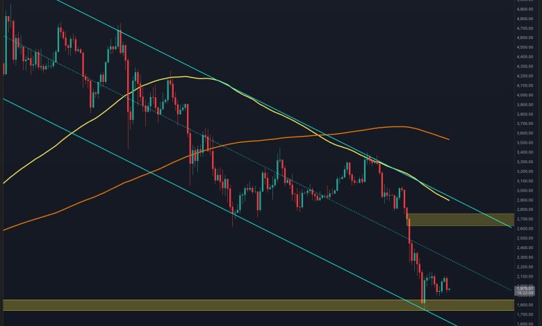 سيكون الاختراق الصحيح فوق مقاومة خط الوسط للقناة مطلوبًا لتحويل الزخم على المدى القصير لصالح المشترين. على العكس من ذلك، فإن الانهيار دون مستوى الدعم البالغ 1800 دولار من شأنه أن يكشف مناطق الطلب المنخفضة ومن المحتمل أن يعيد فرض ضغوط بيع قوية.