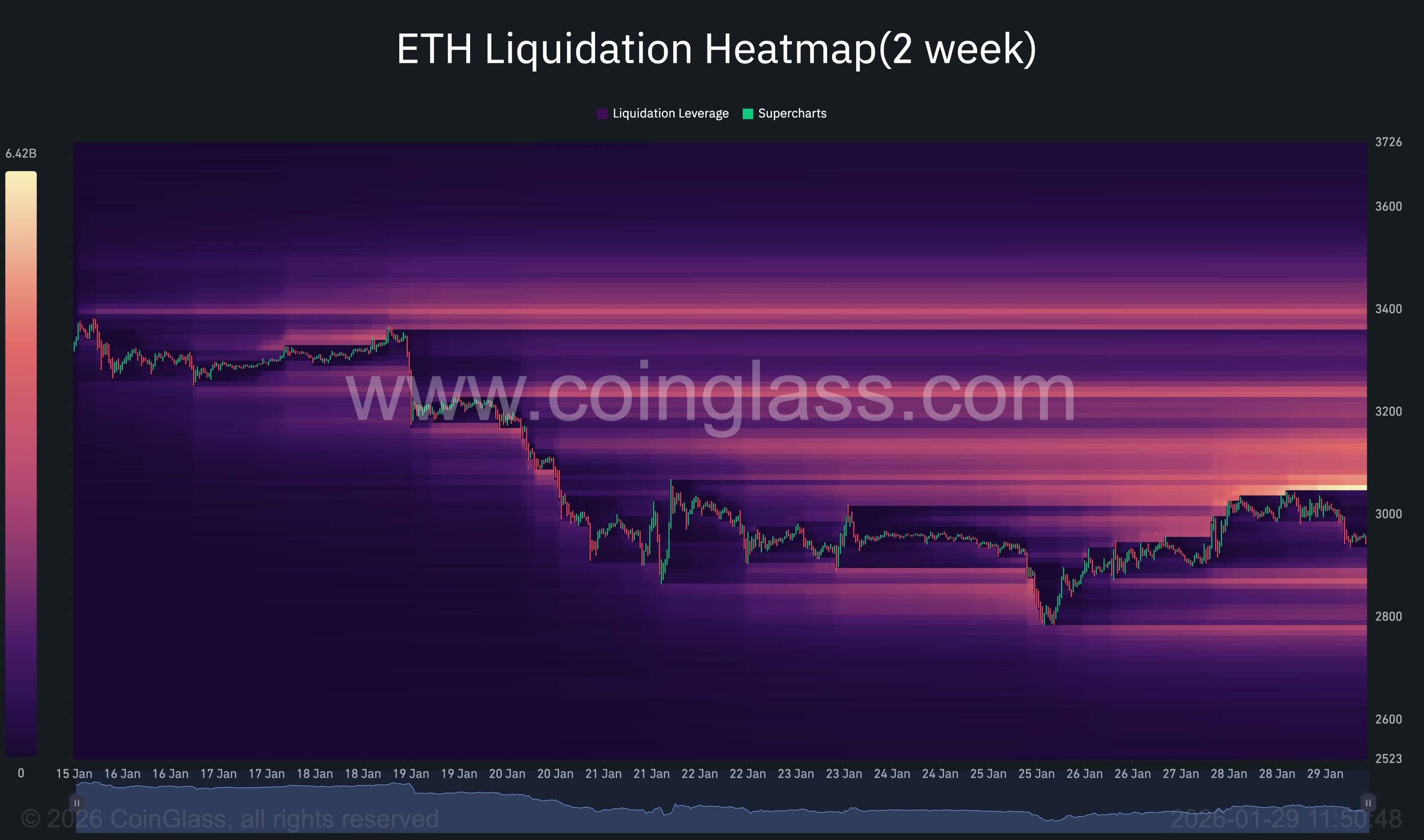 تسلط خريطة حرارة التصفية الضوء على مجموعات سيولة كثيفة تستقر فوق السعر الحالي عند منطقة 3.1 ألف دولار، مع تركيزات كبيرة بشكل خاص. يشير هذا إلى أن التحرك نحو المقاومة يمكن أن يؤدي إلى عمليات تصفية متتالية على الجانب القصير، في حين يمكن استخدام عمليات الاجتياح الهبوطي إلى مجمعات السيولة المنخفضة لإعادة توازن المراكز قبل أي دفعة اتجاهية أكبر.