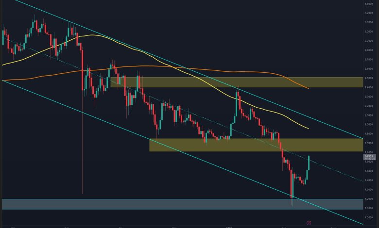 على الإطار الزمني لمدة 4 ساعات، يبدو الانتعاش أكثر اندفاعًا، مع استعادة الشموع الصعودية القوية منطقة العرض قصيرة المدى حول 1.50 دولار – 1.55 دولار. اندفع الأصل إلى منطقة 1.65-1.80 دولار أمريكي، والتي تتوافق مع العرض اللحظي البسيط والحد الأدنى لنطاق التعزيز السابق. إلا أنه تم رفضه هناك وإعادته إلى نقطة البداية.
