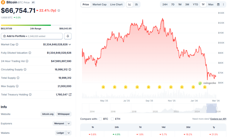 في وقت كتابة هذه السطور، كان تداول البيتكوين عند حوالي 67000 دولار – بانخفاض 2٪ خلال الأسبوع، وبزيادة 5٪ خلال الـ 24 ساعة الماضية، ولكن الأهم من ذلك، بانخفاض 47٪ عن أعلى مستوى له على الإطلاق والذي تم تحقيقه قبل خمسة أشهر فقط. ورغم أن الاتجاه الهبوطي واضح، فإن حل الصراعات الجارية يمكن أن يكون بمثابة حافز للتعافي.