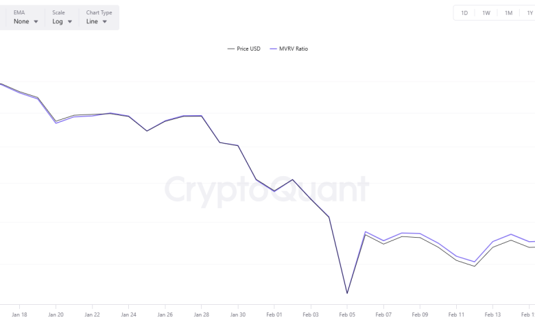 تجدر الإشارة أيضًا إلى بعض المؤشرات وتشكيلات الأسعار. على سبيل المثال، انخفضت القيمة السوقية للبيتكوين إلى القيمة المحققة (MVRV) بشكل مطرد مؤخرًا وتبلغ حاليًا حوالي 1.25. فهو يقارن القيمة الحالية لجميع عملات البيتكوين بالسعر الذي دفعه الأشخاص في الأصل للحصول على ممتلكاتهم. وفقًا لـ CryptoQuant، تشير النسب الأقل من 1 إلى القيعان، في حين أن أي شيء أعلى من 3.7 يشير إلى وجود القمة.