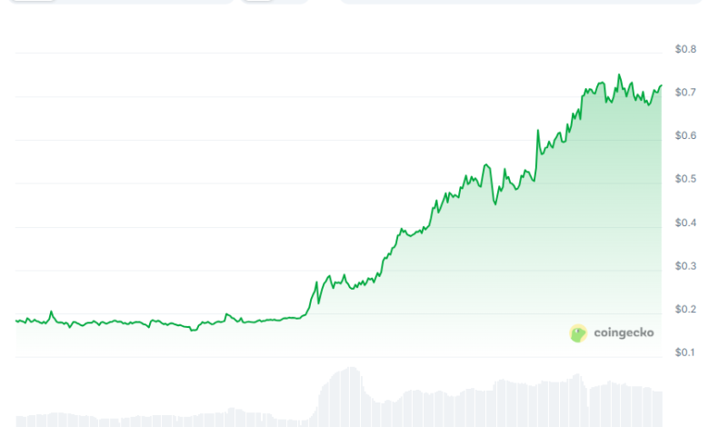 وقد أدى أدائها المثير للإعجاب إلى قيام المتداولين بفتح مراكز شراء تحسبًا لمزيد من المكاسب. كشف مستخدم X Tryrex عن إدخال عند 0.695 دولارًا أمريكيًا برافعة مالية 7x، وإيقاف الخسارة عند 0.6034 دولارًا أمريكيًا، ويهدف إلى جني الأرباح إذا وصل التقييم إلى 0.9755 دولارًا أمريكيًا.