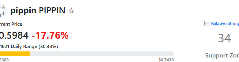 تراجع سعر الأصل بنسبة 20٪ تقريبًا على نطاق يومي ويتم تداوله الآن عند حوالي 0.59 دولار (وفقًا لبيانات CoinGecko). انخفضت القيمة السوقية لشركة PIPPIN إلى أقل من 600 مليون دولار، مما يعرضها لخطر فقدان مكانتها المرموقة بين أكبر 100 عملة مشفرة.