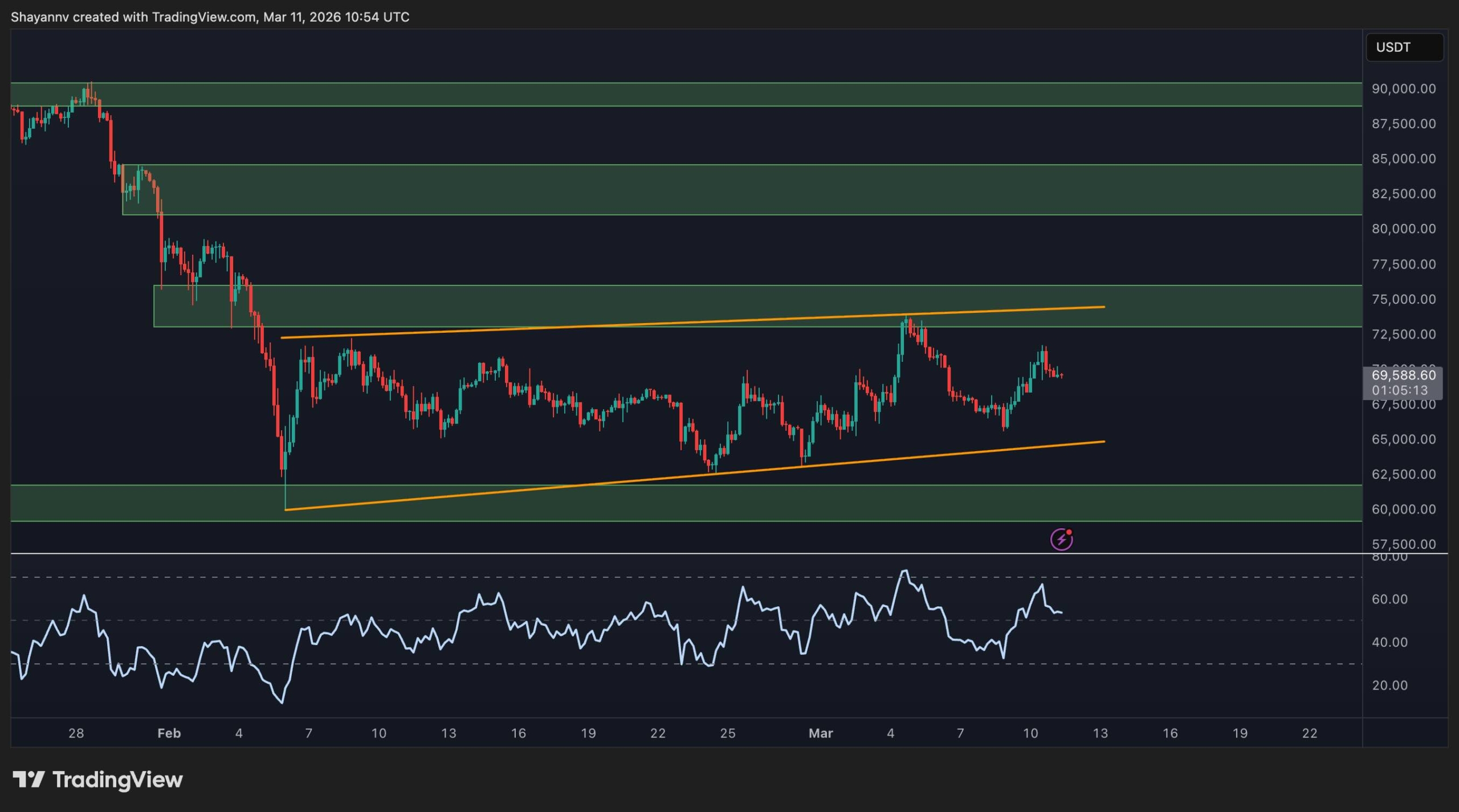 في الوقت نفسه، لم يتمكن المضاربون على الصعود حتى الآن من اختراق الحد العلوي للتشكيل، والذي يأتي بالقرب من منطقة 73000 دولار إلى 75000 دولار ويتداخل مع منطقة مقاومة أوسع. كما تعافى مؤشر القوة النسبية أيضًا باتجاه النصف العلوي من نطاقه، مما يظهر زخمًا متحسنًا، ولكنه ليس حالة اختراق بعد. وهذا يترك الصورة على المدى القصير بناءة، ولكنها لا تزال تعتمد على التحرك المؤكد فوق مقاومة القناة.