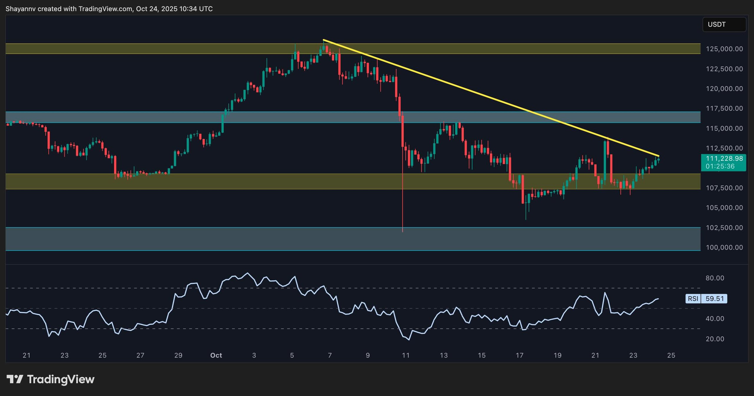 يتحرك مؤشر القوة النسبية أيضًا نحو مستوى 60، مما يشير إلى تزايد الضغط الصعودي ولكنه لم يمتد بشكل مفرط بعد. في حالة اختراق خط الاتجاه الهابط إلى الاتجاه الصعودي، فمن المرجح أن يستهدف السعر منطقة المقاومة البالغة 116 ألف دولار في الأيام القادمة. من ناحية أخرى، من المحتمل أن يؤدي الاختراق الفاشل إلى انخفاض أعمق نحو منطقة الطلب الحرجة البالغة 100 ألف دولار.