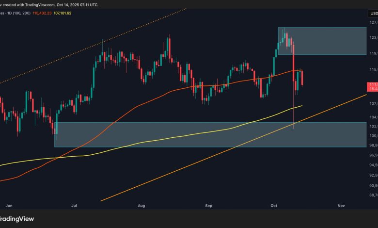 على الإطار الزمني اليومي، تراجعت عملة البيتكوين لإعادة اختبار المتوسط المتحرك لمدة 100 يوم، بالتزامن مع منطقة 116 ألف دولار، حيث استقر السعر مؤقتًا بعد انهيار الأسبوع الماضي. وتتوافق هذه المنطقة مع منتصف الهيكل المحلي وتقع فوق منطقة الطلب التي تتراوح بين 107 آلاف و109 آلاف دولار، والتي تظل منطقة دفاعية حاسمة.