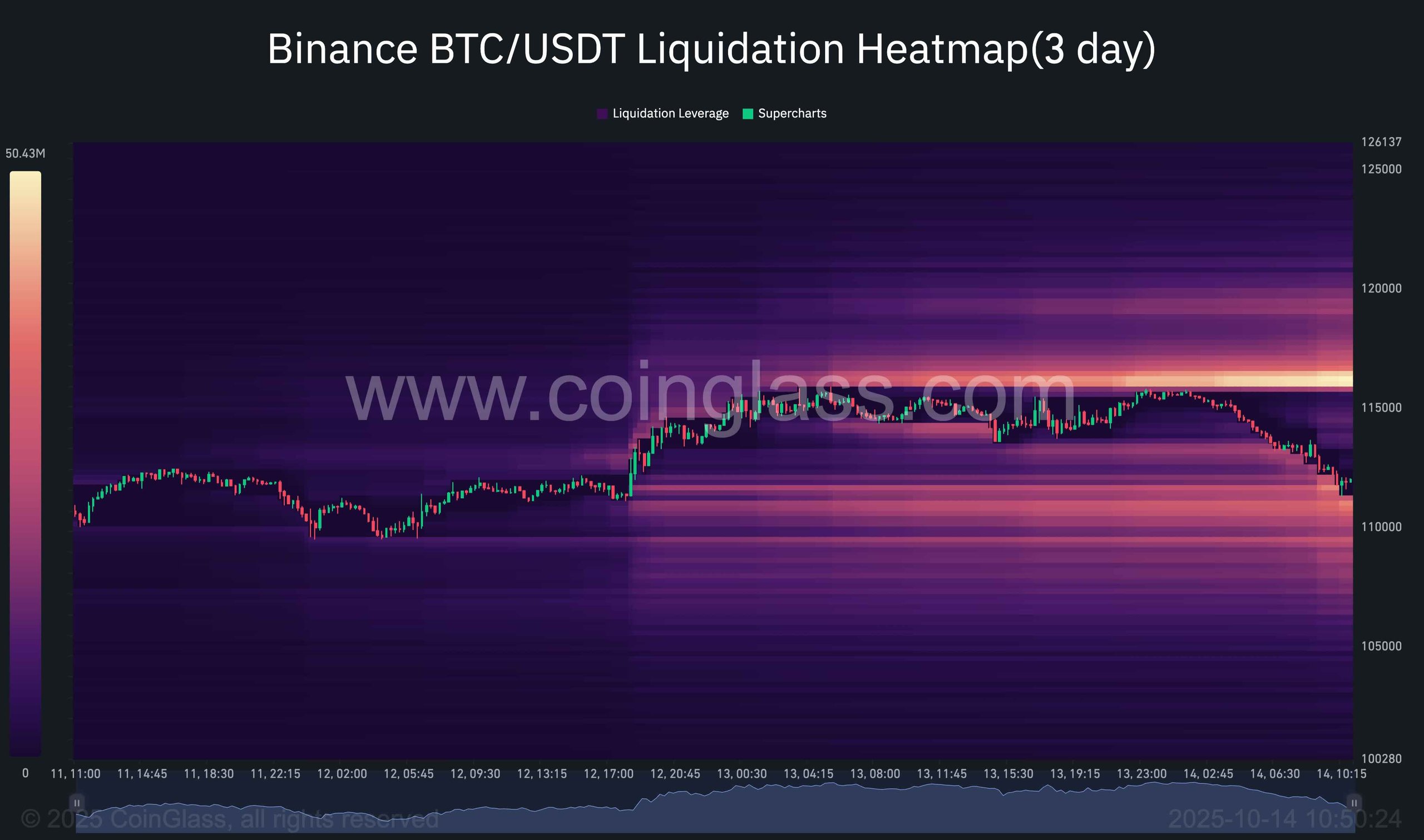 تشير الخريطة الحرارية لتصفية Binance لمدة 3 أيام إلى أن محفظة سيولة كثيفة قد تطورت بين 115 ألف دولار و118 ألف دولار، وهو أعلى مباشرة من سعر السوق الحالي. تتوافق هذه المنطقة مع استراحة عمليات التصفية على المكشوف، مما يشير إلى أنه إذا استعادت عملة البيتكوين النطاق المتوسط، فقد يتبع ذلك تحرك سريع لاستيعاب هذه السيولة.
