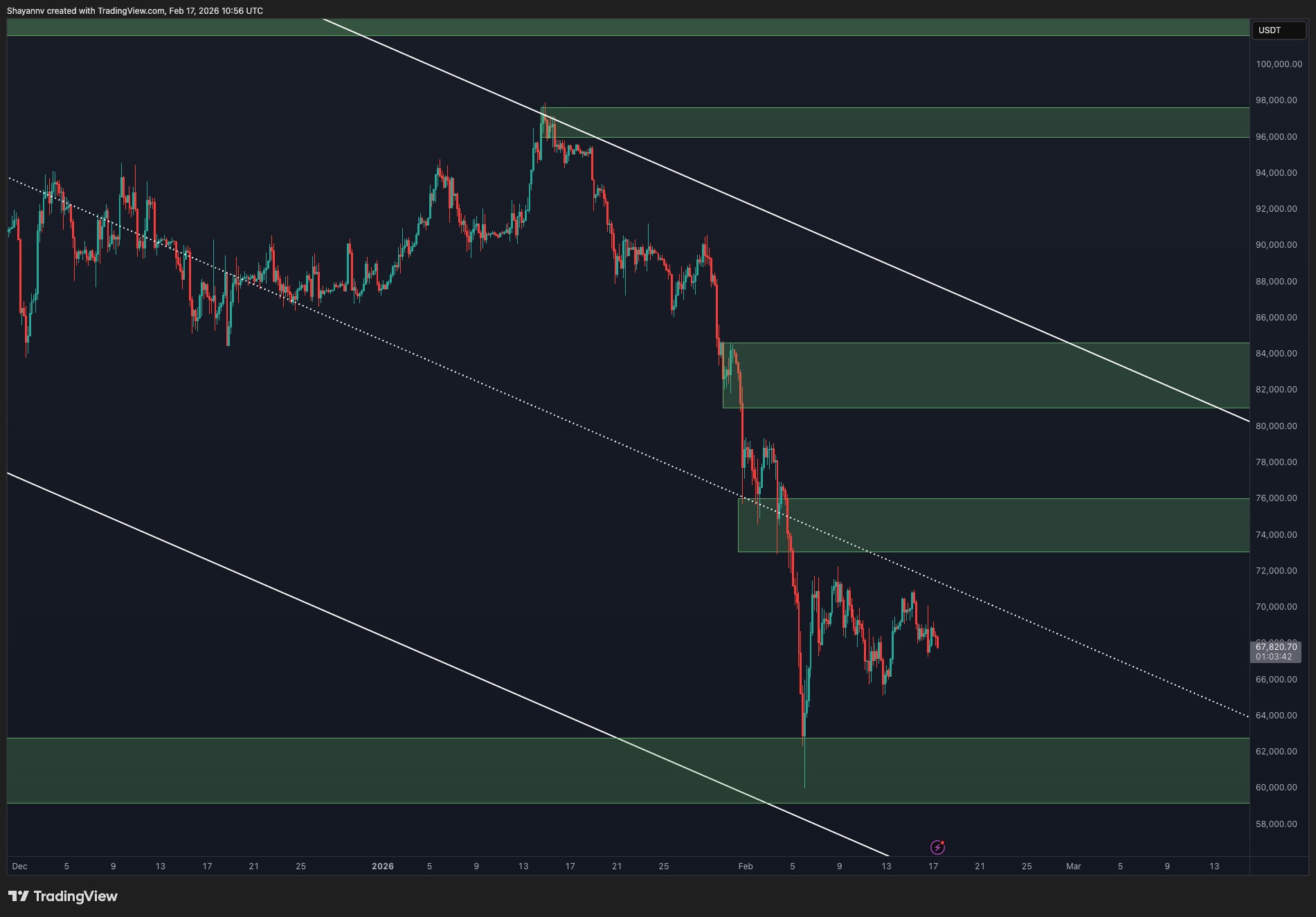 على الإطار الزمني اليومي، لا يزال الأصل يتداول ضمن قناة هابطة محددة جيدًا، حيث يوجه كل من الحدود العلوية والسفلية الهيكل الكلي بوضوح. بعد خسارة مستوى 79 ألف دولار والاختراق بشكل حاسم دون نطاق 75 ألف دولار، تسارعت عملة البيتكوين نحو منطقة الطلب الزرقاء الرئيسية بحوالي 60 ألف دولار، حيث حدث رد فعل قوي.
