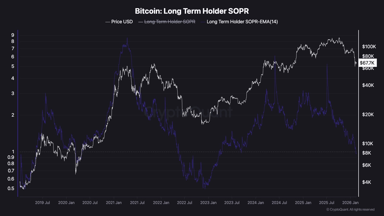 تشير البيانات الموجودة على السلسلة من حامل السندات طويلة الأجل SOPR (LTH-SOPR) إلى أن الضغط الهبوطي المستمر بدأ يؤثر حتى على مجموعة البيتكوين الأكثر مرونة، مما يمثل تحولًا دقيقًا ولكنه مهم في ديناميكيات السوق.