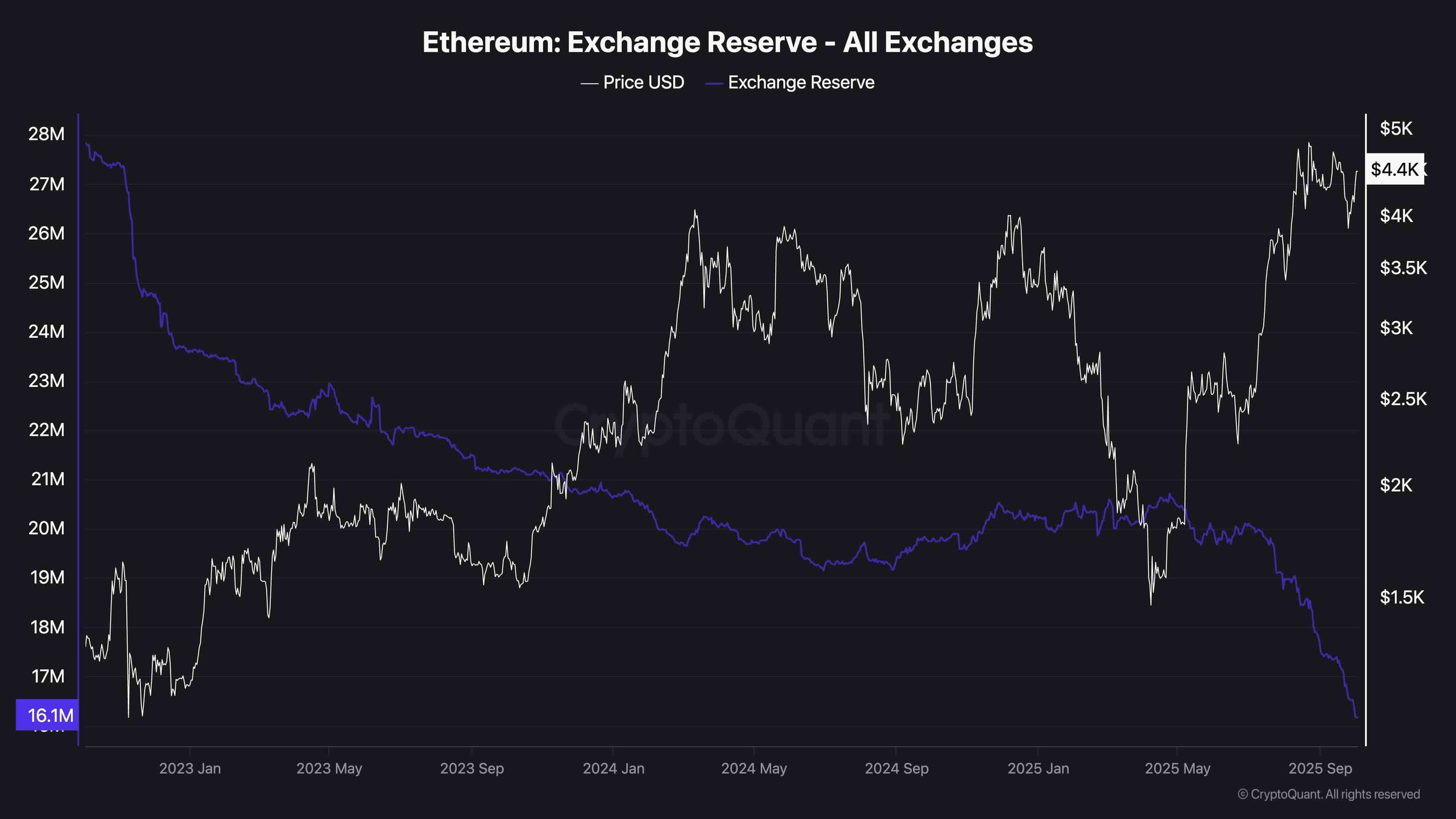 انخفضت احتياطيات التبادل لـ ETH إلى 16.1 مليون ، مما يمثل انخفاضًا ثابتًا متعدد السنوات. يشير هذا إلى أن عددًا أقل من العملات المعدنية محتجزة على البورصات ، وهي إشارة هيكلية صعودية تشير إلى انخفاض ضغط البيع. تاريخيا ، تزامنت هذه الانخفاض مع مراحل وتجمعات التراكم الرئيسية.