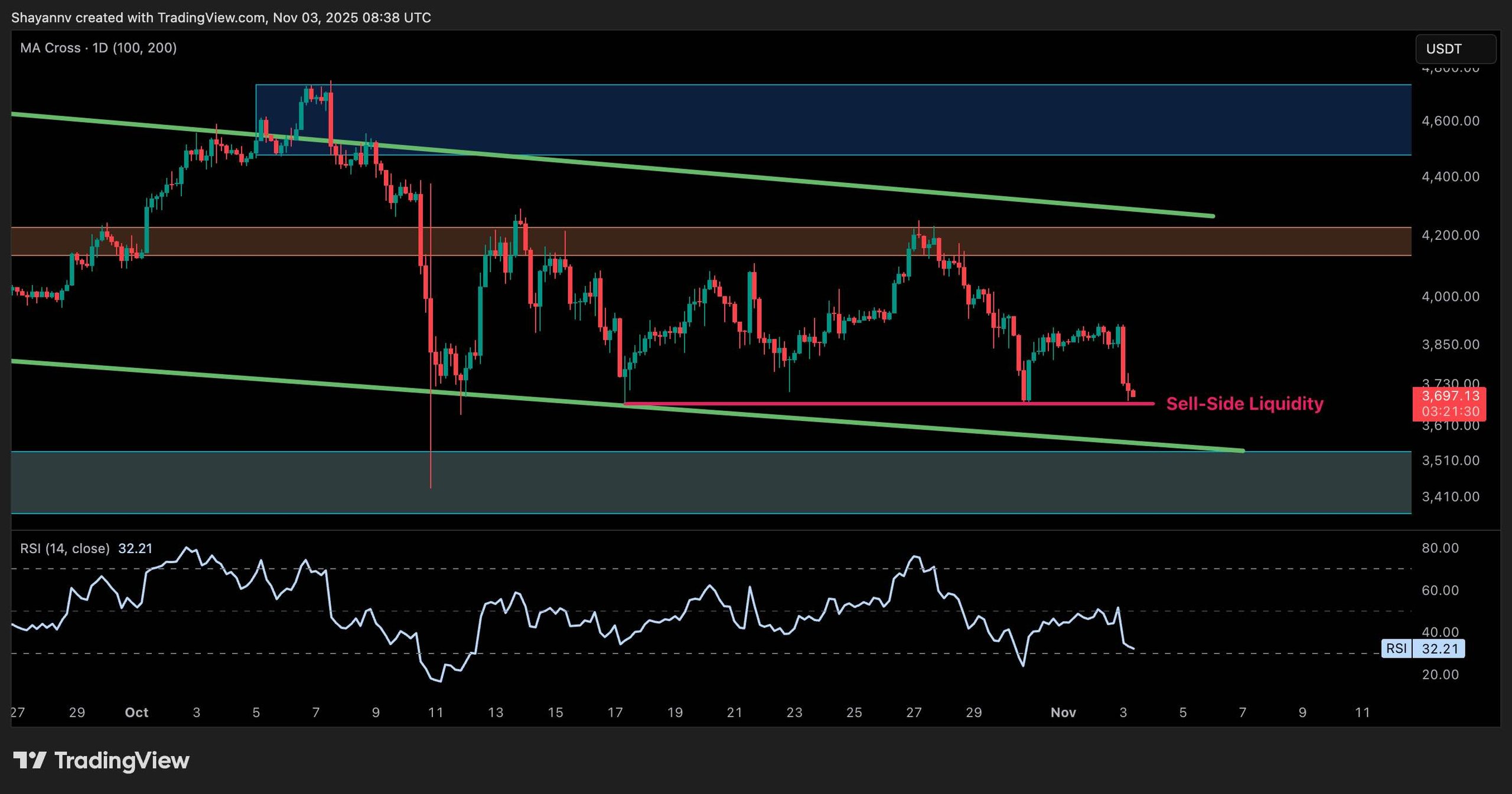 فشلت Ethereum في الحفاظ على الزخم فوق علامة 4000 دولار، وتتجه حركة السعر الآن نحو مستويات الدعم الرئيسية. لا يزال الهيكل الأوسع تصحيحيًا، ومع ميل السعر والمعنويات إلى الهبوط، يبدو أن ETH تدخل مرحلة أكثر ضعفًا. ولا تزال التقلبات منخفضة، ولكن الضغط الهبوطي يتزايد تدريجياً.