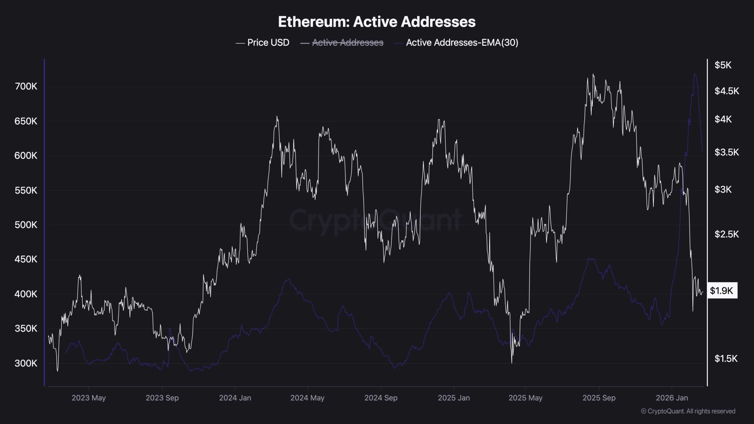 تُظهر بيانات العناوين النشطة ارتفاعًا حادًا في نشاط الشبكة مؤخرًا، مع ارتفاع المتوسط المتحرك الأسي (EMA) لمدة 30 يومًا للعناوين النشطة إلى أعلى مستوياته خلال عدة أشهر. تاريخيًا، تزامنت توسعات مماثلة في النشاط مع فترات من التقلبات الشديدة وغالبًا ما تسبق التحركات الاتجاهية الرئيسية.