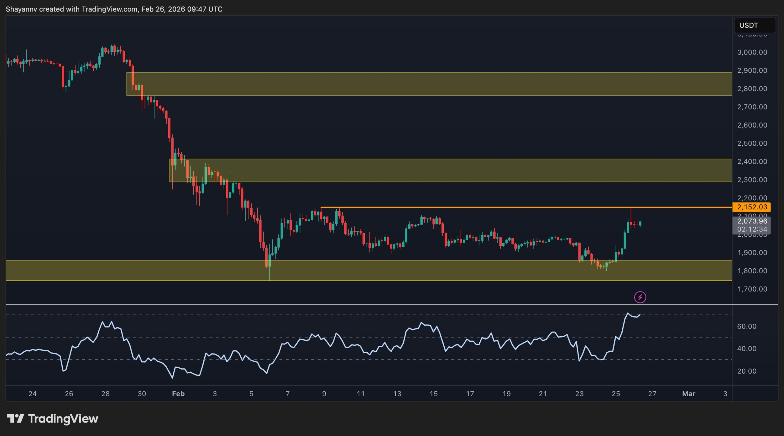 أدى الارتداد من هذا الدعم إلى دفع مؤشر القوة النسبية للخروج من منطقة ذروة البيع وحمل السعر مرة أخرى نحو الخط الأوسط للقناة، لكن إيثريوم لا يزال يقع تحت مجموعة المقاومة الرئيسية التي تشكلها منطقة العرض 2300-2400 دولار، في حين أن المتوسطات المتحركة المنخفضة لمدة 100 يوم (الأصفر) و 200 يوم (البرتقالي) لا تزال في الأعلى.