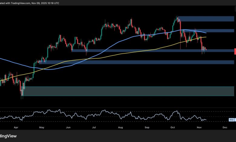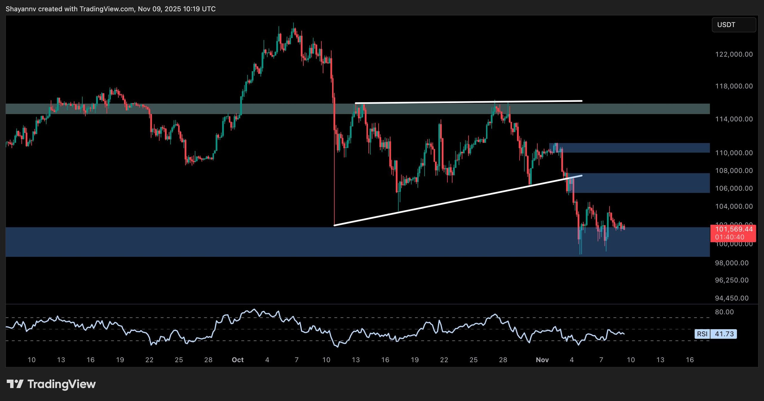 على الإطار الزمني اليومي، كسرت البيتكوين ما دون المتوسطين المتحركين لمدة 100 يوم و200 يوم، الواقعين بالقرب من علامة 110 ألف دولار، مما يشير إلى أن الزخم على المدى القصير قد تحول إلى الاتجاه الهبوطي. ويحوم السعر حاليًا حول المستوى الرئيسي البالغ 100 ألف دولار، والذي كان بمثابة دعم خلال التصحيحات الأخيرة.