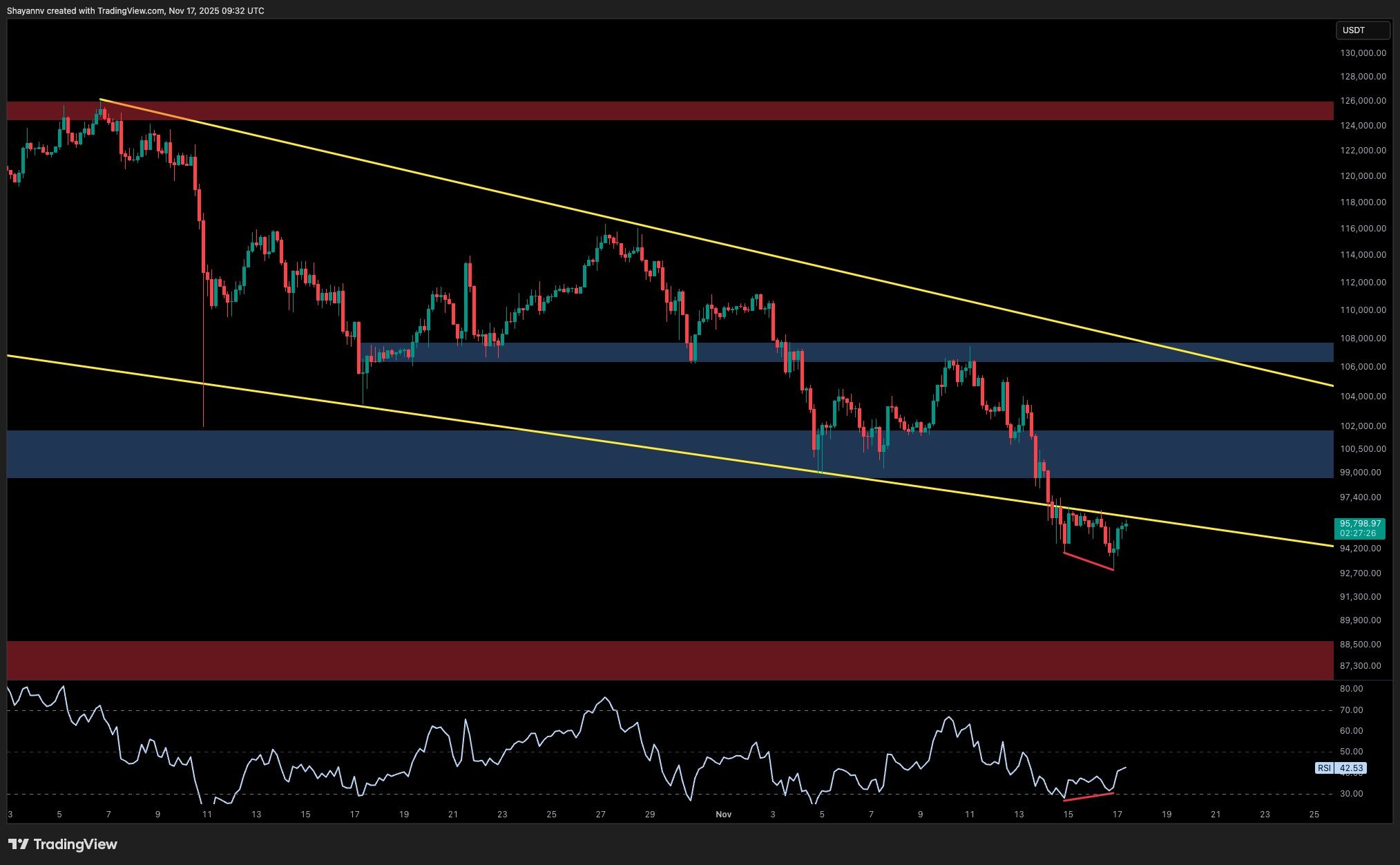 تحاول Bitcoin الاستقرار حول منطقة 95000 دولار بعد تصحيح حاد من منطقة 110000 دولار. وبينما لا يزال الاتجاه الأوسع تحت الضغط، فإن علامات الدعم المؤقت تتشكل. يمكن أن يساعد تفصيل ظروف السوق عبر الرسم البياني اليومي والإطار الزمني لأربع ساعات والمقياس الرئيسي على السلسلة في تقييم ما قد يأتي بعد ذلك.