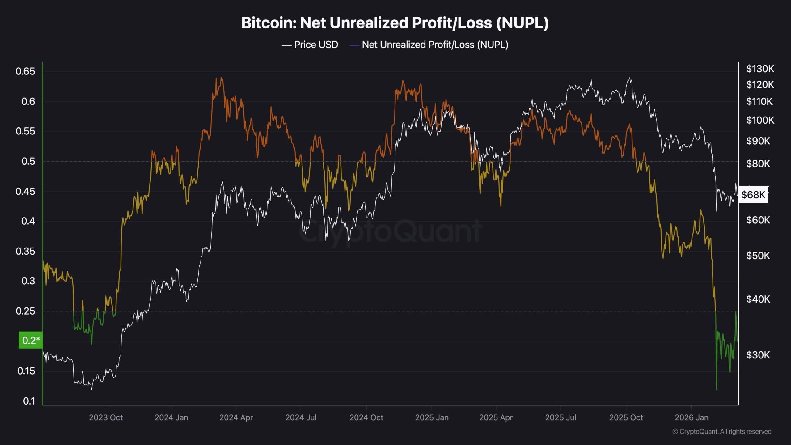 من منظور السلسلة، انخفض صافي الأرباح والخسائر غير المحققة في Bitcoin، أو NUPL، بشكل حاد ويستقر الآن حول 0.20. يعد هذا بمثابة إعادة ضبط كبيرة مقارنة بالقراءات المبهجة التي شوهدت أثناء الارتفاع نحو أعلى مستويات الدورة.