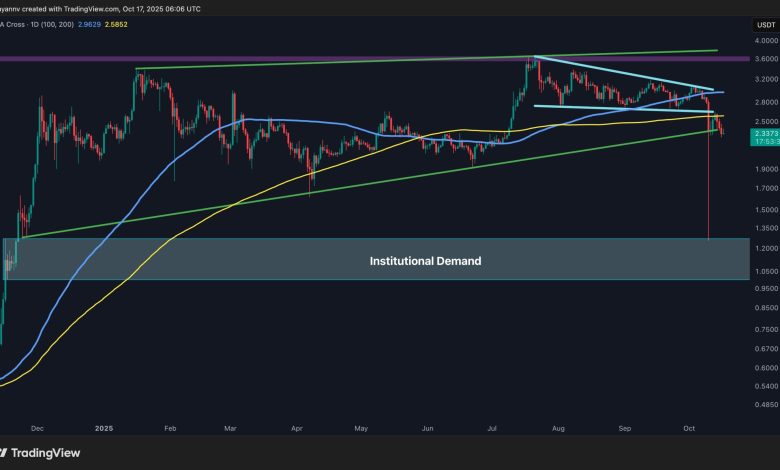 حاليًا، يحوم الأصل حول منطقة 2.3 دولار، والتي تتداخل مع المتوسط ​​المتحرك لـ 200 يوم والحد الأدنى لنمط الوتد. تعمل هذه المنطقة بمثابة حاجز فني نهائي قبل أن يعود السعر إلى منطقة الطلب المؤسسي بين 2 دولار و1.3 دولار، حيث حدثت تراكمات كبيرة طويلة الأجل في وقت سابق من هذا العام.