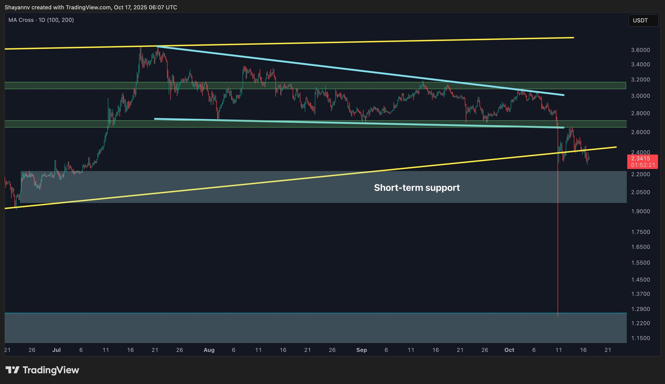 حاليًا، يحوم الأصل حول منطقة 2.3 دولار، والتي تتداخل مع المتوسط ​​المتحرك لـ 200 يوم والحد الأدنى لنمط الوتد. تعمل هذه المنطقة بمثابة حاجز فني نهائي قبل أن يعود السعر إلى منطقة الطلب المؤسسي بين 2 دولار و1.3 دولار، حيث حدثت تراكمات كبيرة طويلة الأجل في وقت سابق من هذا العام.