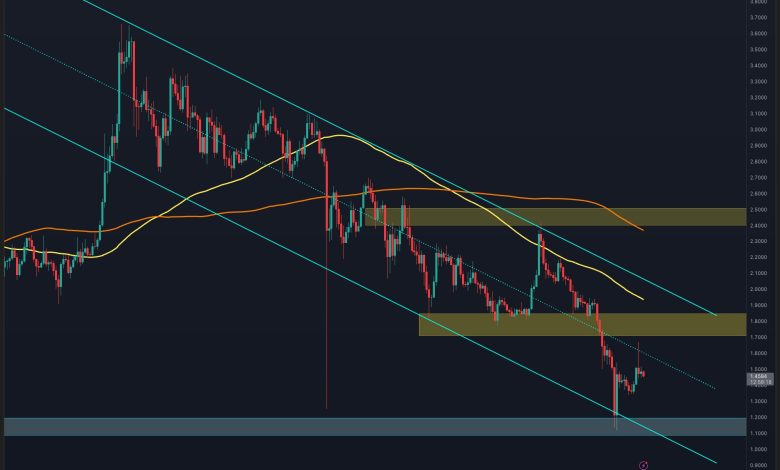 تم رفض العملة البديلة الشهيرة عند خط الوسط للقناة طويلة المدى، مما أدى إلى اكتساح السيولة. ومع ذلك، فإن XRP تمر بمرحلة انتعاش قصيرة المدى ضمن إطار هبوطي أوسع، ومن المرجح أن يحدد الاختراق المؤكد من نطاق 1.2 إلى 1.8 دولار الحركة المندفعة التالية.