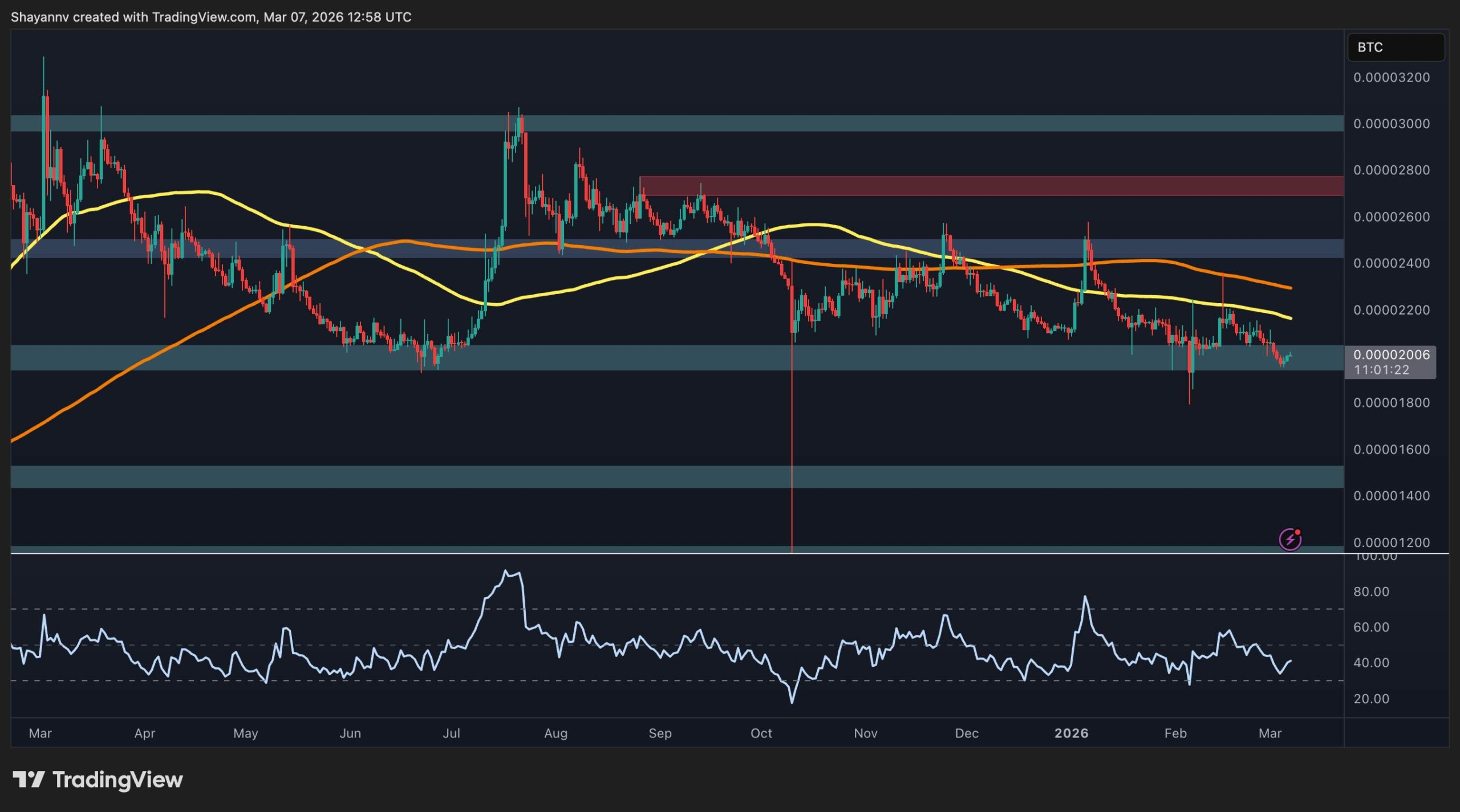 مقابل البيتكوين، فإن XRP أيضًا في وضع ضعيف ويستمر في الاتجاه الهبوطي بينما يتم تداوله تحت كلا المتوسطين المتحركين الرئيسيين. يتم تداول الزوج حول 2000 يوم، مع تراجع السعر مؤخرًا مرة أخرى تحت مجموعة المقاومة التي تتراوح بين 2200 و2400 يوم والتي نشأت عن التقاء المتوسطين المتحركين لمدة 100 يوم و200 يوم.