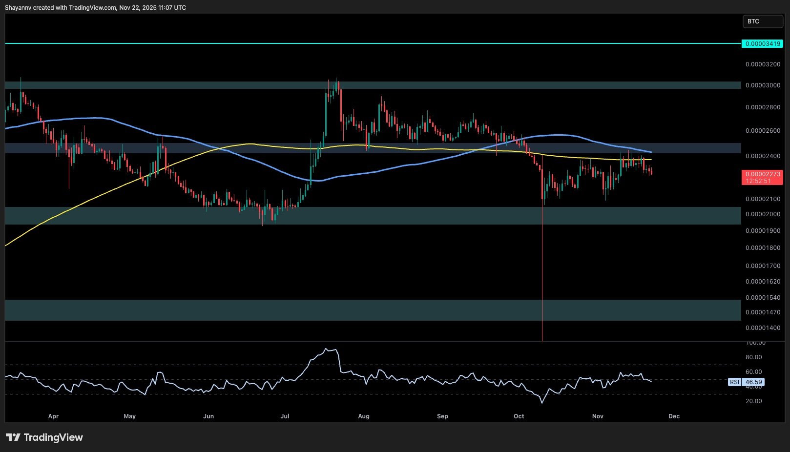 مقابل البيتكوين، يظهر XRP ضعفًا نسبيًا أيضًا. يكافح السعر للثبات فوق علامة 2200 SAT وفشل في اختراق التقاء المتوسطين المتحركين 100 يوم و200 يوم، وكلاهما يعمل كمقاومة ديناميكية بالقرب من منطقة 2400 SAT، وهو ما يمثل عائقًا رئيسيًا أمام استمرار الاتجاه الصعودي بحد ذاته.