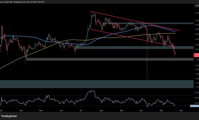 انهار XRPUSDT بشكل حاسم من هيكل القناة الهابطة ويتم تداوله الآن تحت مستوى الدعم الرئيسي البالغ 2 دولار، والذي تحول الآن إلى منطقة مقاومة. وكانت الحركة الأخيرة حادة، حيث انخفض السعر نحو منطقة الطلب الرئيسية التالية حول 1.75 دولار.