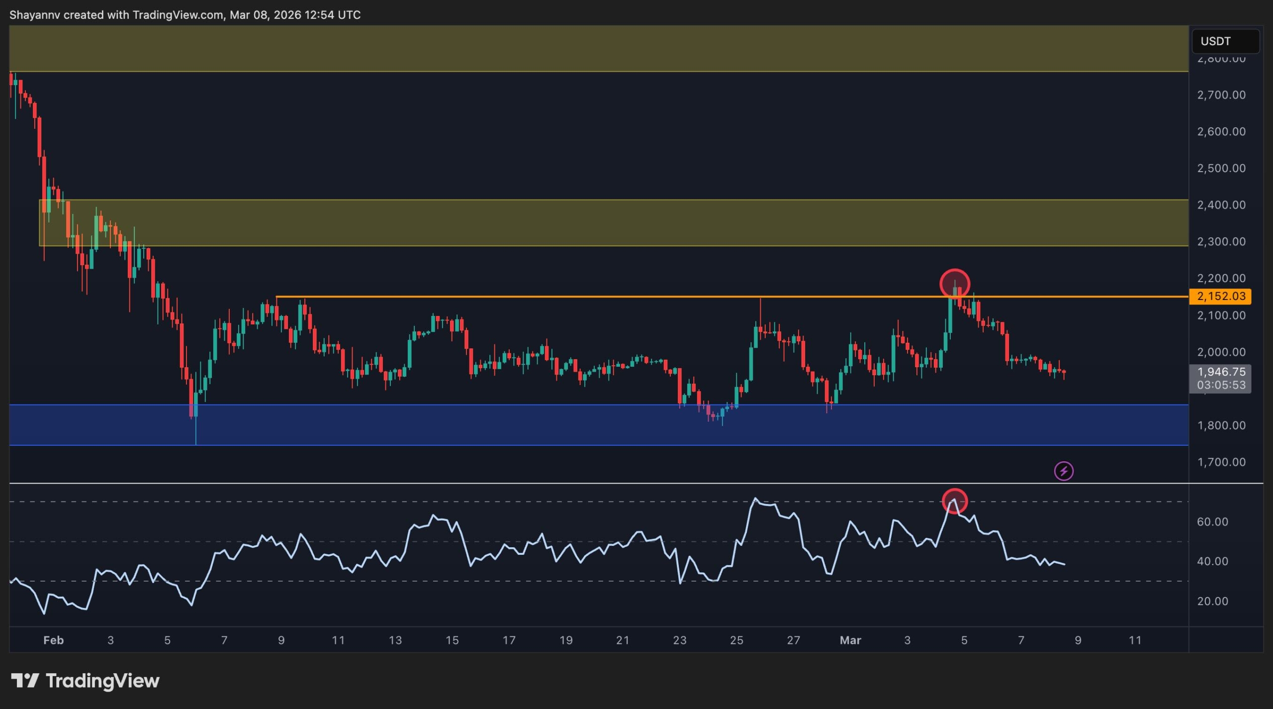 على الرسم البياني لمدة 4 ساعات، اندفعت ETH مؤخرًا إلى منطقة المقاومة البالغة 2,150 دولارًا ولكنها تم رفضها سريعًا، لتشكل قمة منخفضة محلية وتؤكد أن هذا المستوى لا يزال يمثل سقفًا مهمًا على المدى القصير. كما طبع مؤشر القوة النسبية أيضًا إشارة ذروة الشراء بالقرب من هذا الرفض. منذ ذلك الحين، انجرف السعر مرة أخرى نحو النطاق المتوسط حول 1950 دولارًا، مما يدل على عدم وجود اهتمام قوي بالشراء بعد محاولة الاختراق الفاشلة.