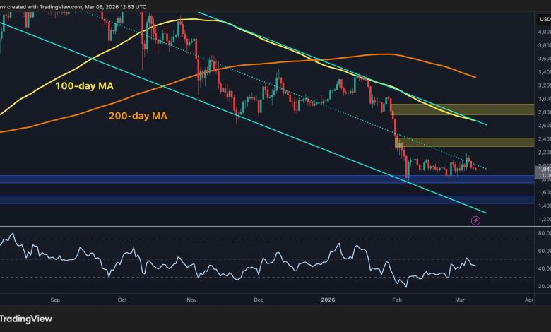 لا يزال الإيثريوم تحت ضغط واسع النطاق عبر الأطر الزمنية الأعلى، مع استمرار تداول السعر أقل بكثير من متوسطاته المتحركة الرئيسية وداخل هيكل سوق هبوطي مهيمن. في حين أن الانتعاش الأخير من أدنى مستوياته في فبراير ساعد إيثريوم على الاستقرار عند حوالي 1900 دولار، إلا أن الرسوم البيانية لا تزال تشير إلى أن المشترين يكافحون من أجل استعادة أي مقاومة ذات معنى، مما يجعل التوقعات قصيرة المدى حذرة في الوقت الحالي.