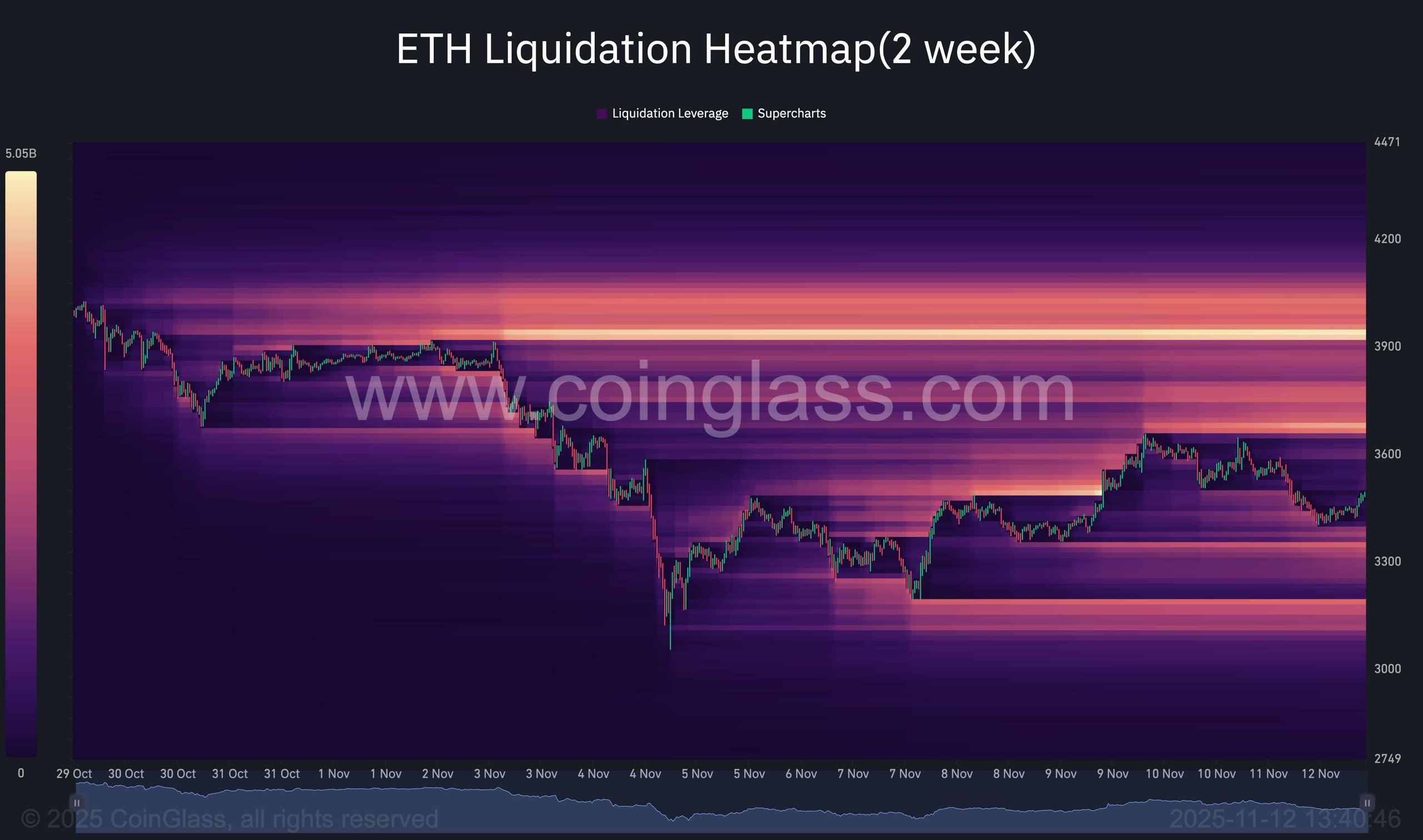 تكشف خريطة حرارة التصفية لمدة أسبوعين لـ ETH أن مجموعات كثيفة من المراكز ذات الرافعة المالية قد تراكمت في منطقتين رئيسيتين: