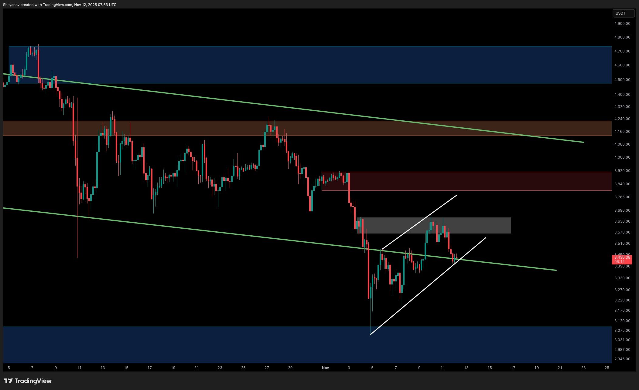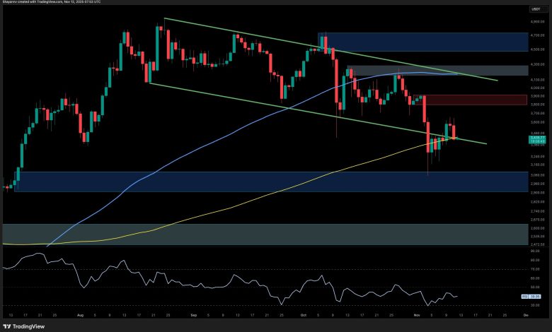 على الإطار الزمني اليومي، تظل ETH محصورة داخل قناة موازية هابطة، وتؤكد عمليات الرفض المستمرة من الحدود العلوية والمتوسطة هيمنة النموذج المستمر. فشل السعر في الحفاظ على مستوى المقاومة فوق 3.6 ألف دولار – 3.7 ألف دولار، مما أدى إلى تجدد ضغوط البيع حيث يعيد اختبار الحد الأدنى للقناة والمتوسط المتحرك 200 يوم (حوالي 3.3 ألف دولار).