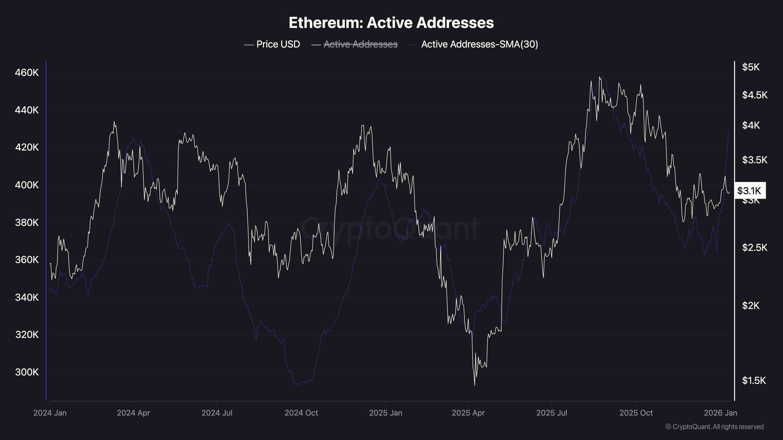 يتجه المتوسط المتحرك البسيط (SMA) للعناوين النشطة لمدة 30 يومًا لـ Ethereum إلى الأعلى مرة أخرى، بعد الانخفاض الكبير في الربع الثالث إلى الربع الرابع من عام 2025. تاريخيًا، غالبًا ما يسبق نشاط العناوين المتزايد أو يتزامن مع ارتفاعات الأسعار المستدامة، والارتفاع الأخير ليس استثناءً. اعتبارًا من الآن، تحوم العناوين النشطة فوق 400 ألف، مما يعكس المستويات التي شوهدت خلال الاتجاه الصعودي الرئيسي الأخير.