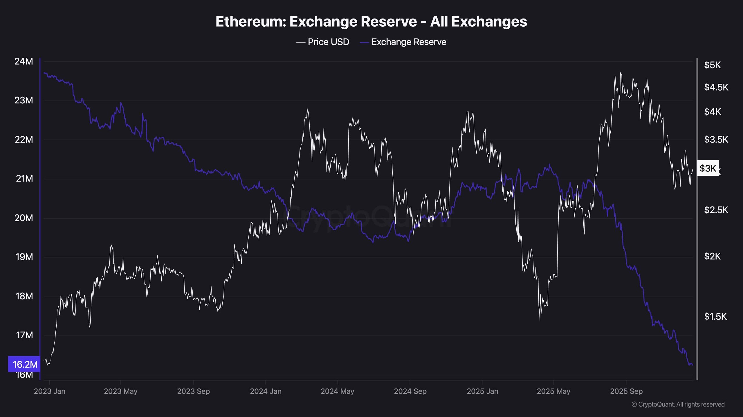 تستمر احتياطيات صرف الإيثريوم في الانخفاض بقوة، حيث وصلت الآن إلى أدنى مستوياتها منذ سنوات (حوالي 16.2 مليون إيثريوم). يشير هذا إلى تراكم طويل الأجل وانخفاض ضغط البيع من جانب حاملي الأسهم.