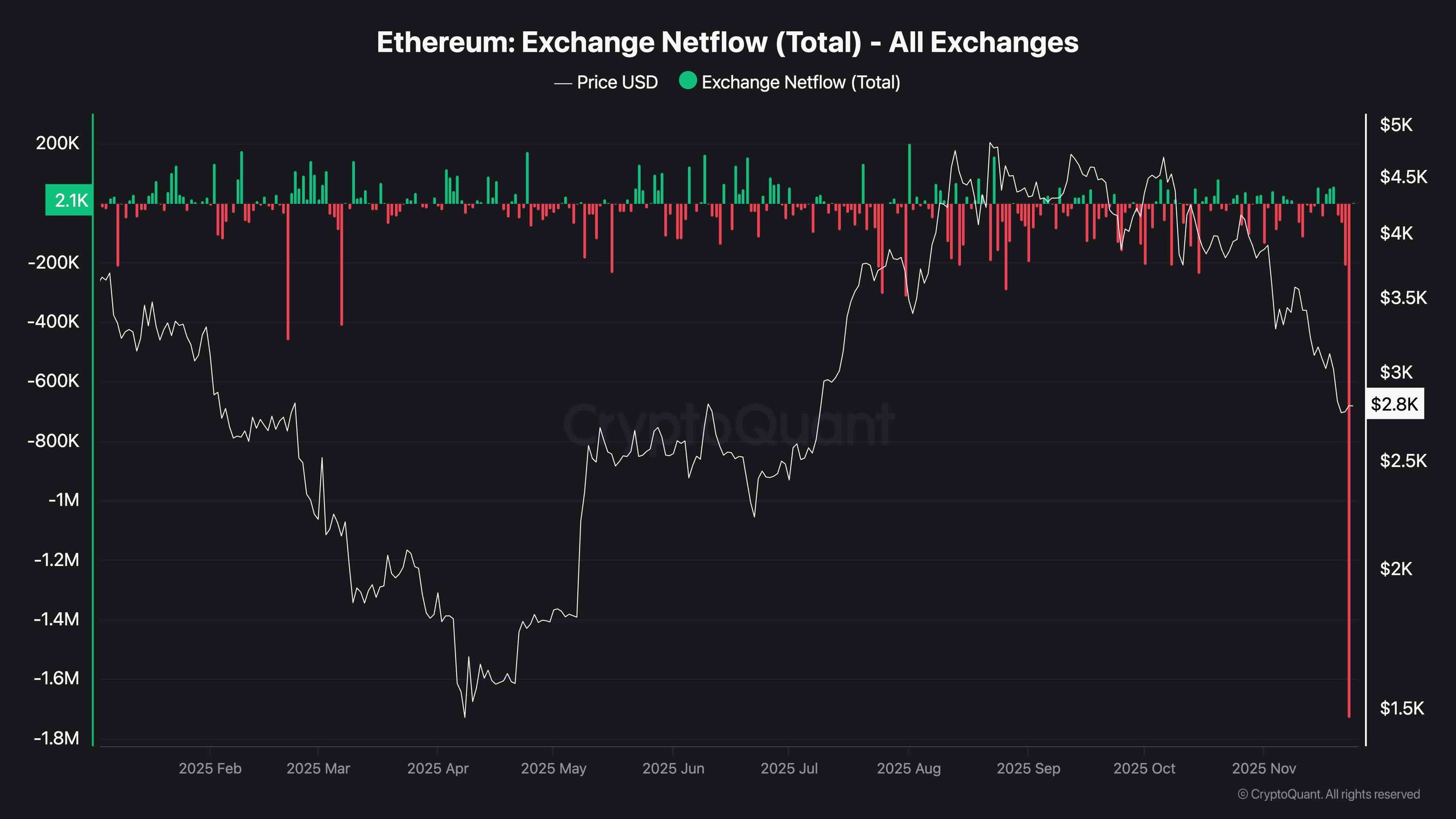 في يوم الأحد الموافق 23 نوفمبر، شهد إيثريوم ارتفاعًا حادًا في التدفقات الخارجة من البورصات، مما أدى إلى واحدة من أكبر التدفقات الصافية السلبية في السنوات الأخيرة. وهذا يعني أنه تم سحب كمية كبيرة من ETH من البورصات المركزية.