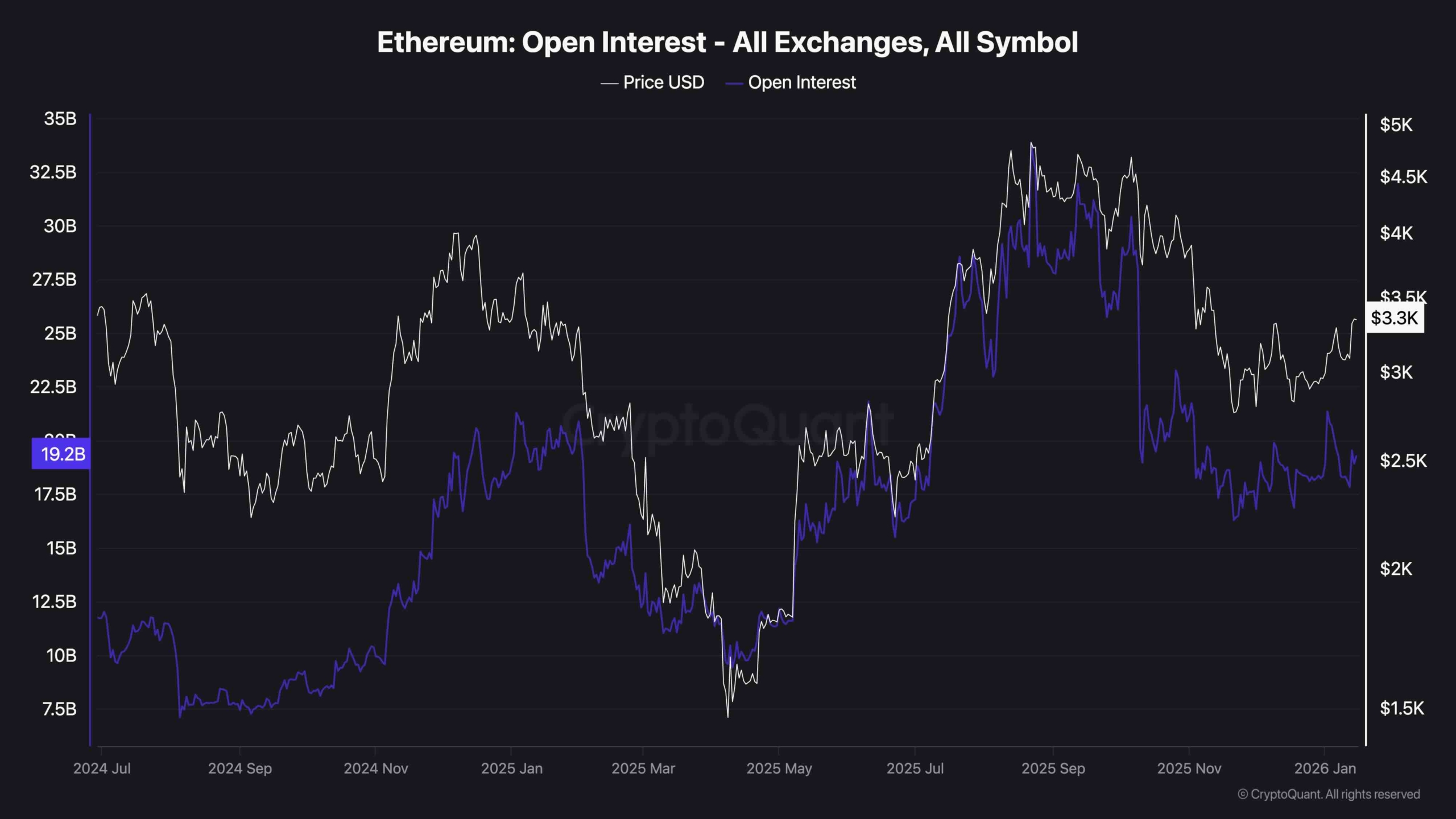 من منظور معنويات سوق العقود الآجلة، كانت الفائدة المفتوحة لـ Ethereum تتأرجح أفقيًا، وتبلغ الآن حوالي 19.2 مليار دولار في جميع البورصات.
