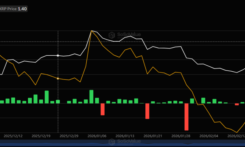 على الرغم من نزوح المستثمرين، كان أداء سعر XRP جيدًا إلى حد ما في الأسبوع الماضي، حيث قفز من أدنى مستوى له يوم الاثنين عند 1.34 دولارًا إلى أعلى مستوى خلال عدة أسابيع بما يزيد قليلاً عن 1.45 دولار. ومع ذلك، فقد توقف عند هذا الحد ويكافح الآن تحت مستوى 1.40 دولار.