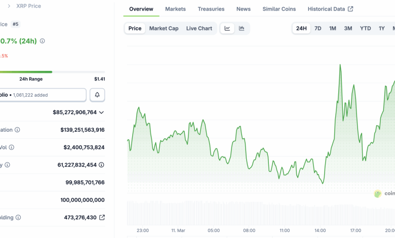 ومع ذلك، ظل سعر XRP ثابتًا بعد هذه الأخبار الأخيرة. وفي وقت كتابة هذه السطور، يتم تداول العملة المشفرة عند 1.39 دولارًا أمريكيًا، بزيادة قدرها 0.7٪ خلال الـ 24 ساعة الماضية.