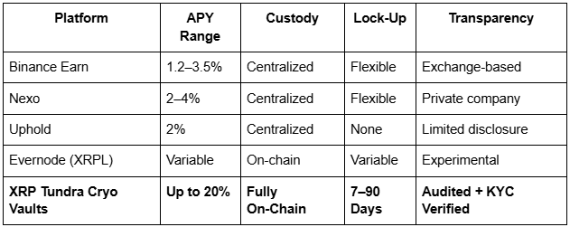لفهم سبب أهمية إطلاق Cryo Vault، من المفيد أن ننظر إلى البدائل. تقدم البورصات التقليدية ومنصات الحراسة عوائد متواضعة – عادة ما تتراوح بين 1٪ و 4٪ – وتتطلب من المستخدمين الثقة في المحاسبة الداخلية للشركة. في المقابل، يعمل نظام XRP Tundra بالكامل على السلسلة، ويخضع للتدقيق العام، مع ملكية المحفظة المباشرة.