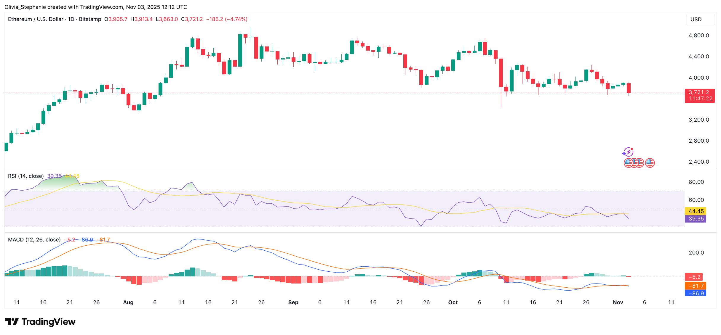 ويتم تداول إيثريوم (ETH) عند حوالي ٣٧٠٠ دولار في وقت النشر، بانخفاض أكثر من ٤٪ خلال ٢٤ ساعة وحوالي ١١٪ خلال الأسبوع.