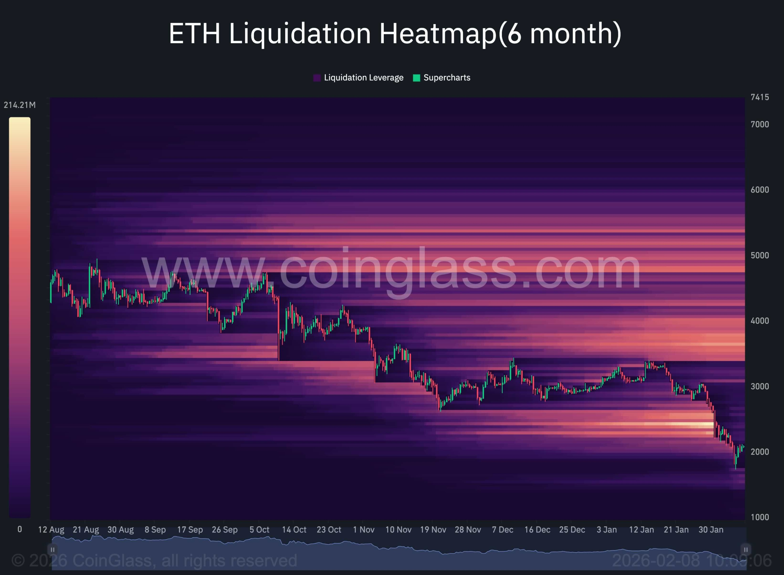 توفر الخريطة الحرارية لتصفية ETH على مدار الأشهر الستة الماضية تأكيدًا حاسمًا للهيكل الفني الهبوطي. تم بناء تركيز كبير للسيولة حول مستوى 2 ألف دولار وأقل بقليل، والذي كان بمثابة نقطة جذب قوية للسعر مؤخرًا. تؤكد عمليات البيع الحادة في هذه المنطقة أن السيولة الهبوطية كانت مستهدفة بشكل نشط، مما أدى إلى تدفق كبير في المراكز الطويلة ذات الرافعة المالية.