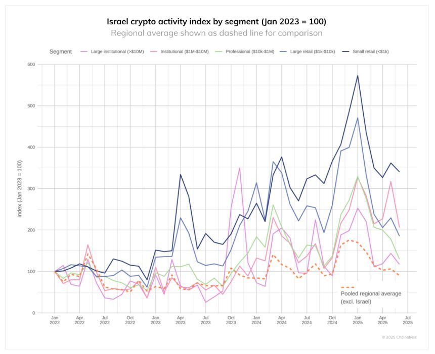 وبشكل عام، تجاوز النشاط الفعلي المستويات المتوقعة بنسبة 60.4% في المتوسط، مما يدل على زيادة مستمرة وليس ارتفاعًا مؤقتًا استجابة لظروف الأزمة. واستمر هذا النمط حتى عام 2024 وحتى عام 2025، فيما اعتبرته تشيناليسيس تحولًا سلوكيًا دائمًا بين مستخدمي العملات المشفرة الإسرائيليين ووضع الأصول الرقمية كملاذ مالي خلال فترات عدم اليقين الوطني.