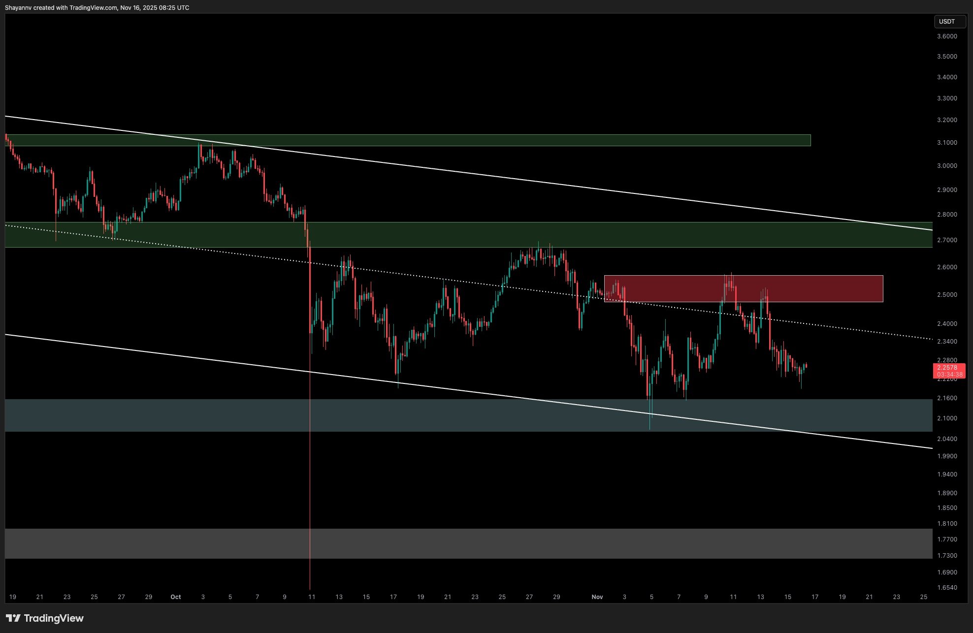على الإطار الزمني اليومي، يستمر رمز Ripple في التداول ضمن تشكيل قناة هابطة كبيرة، وهو هيكل غالبًا ما يسبق الانعكاسات الصعودية عندما يدعمها توسع الحجم. بعد الارتداد من منطقة الطلب التي تتراوح بين 2.1 و2.2 دولار، استعاد السعر الأرض نحو 2.5 دولار، متماشيًا مع منطقة العرض الحاسمة (كتلة الطلب) وقريبًا من المتوسط ​​المتحرك لمدة 200 يوم، في حين يظل المتوسط ​​المتحرك لـ 100 يوم مرتفعًا قليلاً بالقرب من 2.7 دولار.