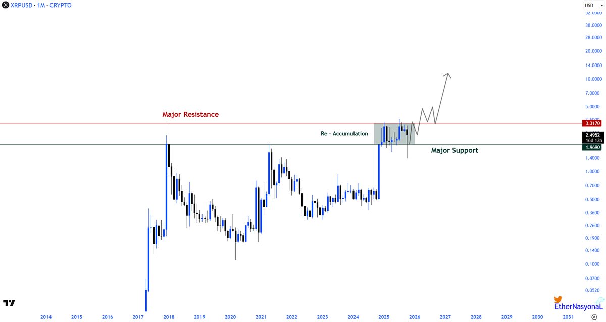 على الرسم البياني XRP/USD، يستمر الأصل في التحرك بين 2 دولار و3.3 دولار. وهذه هي أعلى المستويات المسجلة في عامي 2021 و2017 على التوالي. وفقًا للمحلل EtherNasyonaL، لا تزال XRP في مرحلة إعادة التراكم. لقد كتبوا،