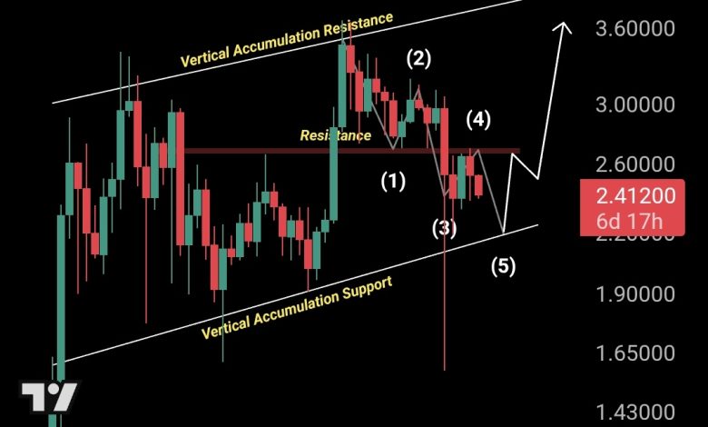 يوضح الرسم البياني الخاص به التحرك المتوقع عبر مناطق الدعم المنخفضة، ومن المحتمل أن يصل إلى 2.25 دولار قبل أي انتعاش. يشير الهيكل إلى اتجاه هبوطي قصير المدى، على الرغم من أن مستويات الدعم الأطول مدى لا تزال محل احترام.